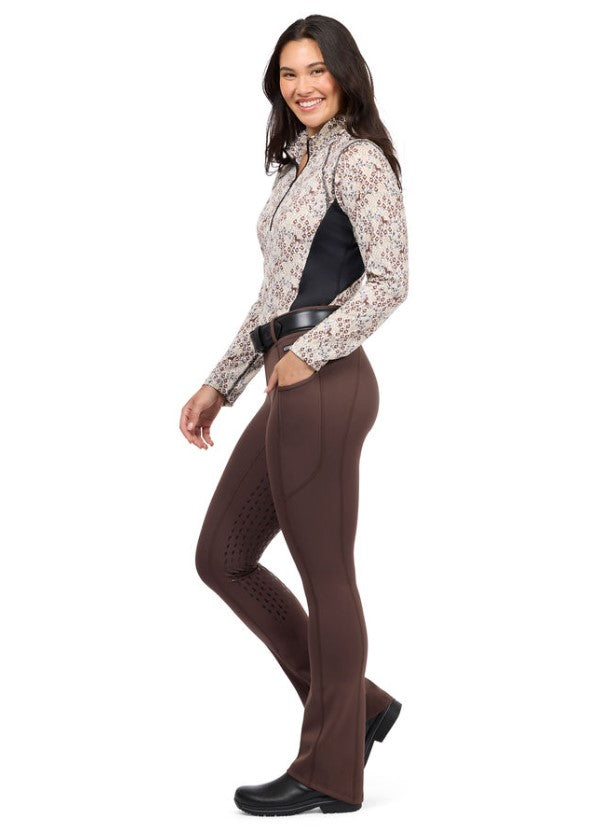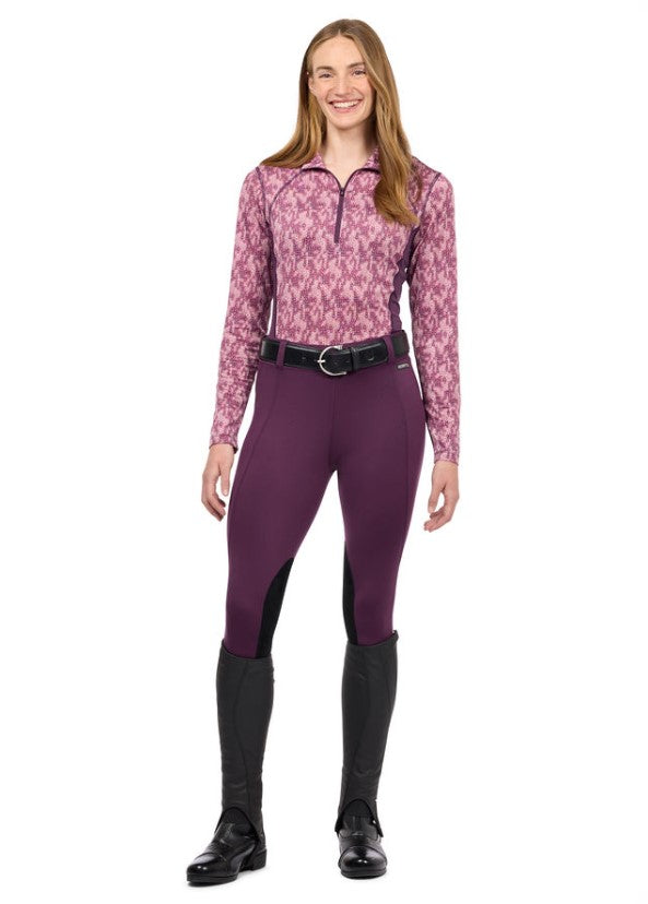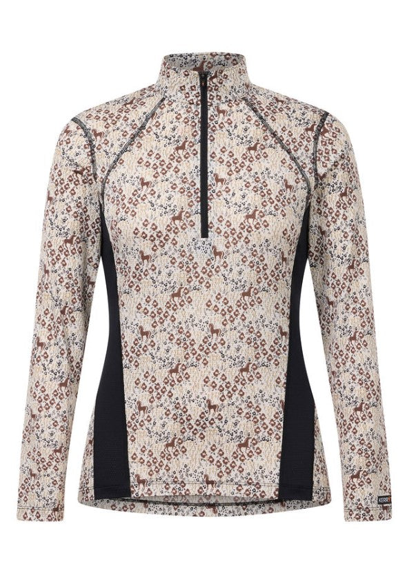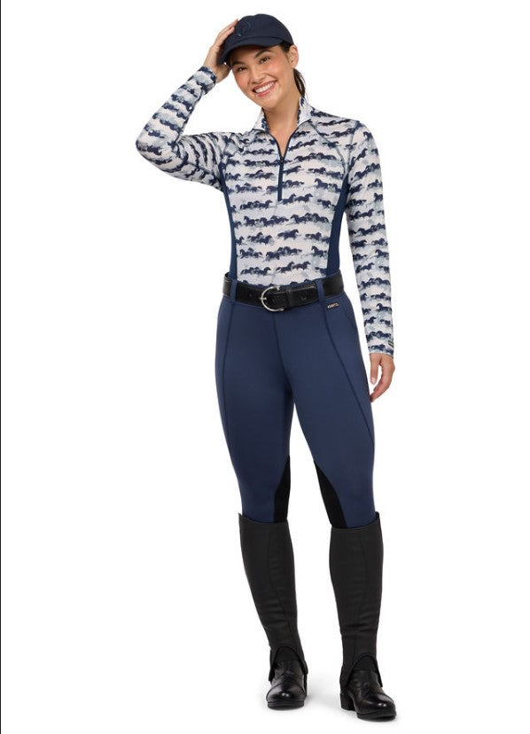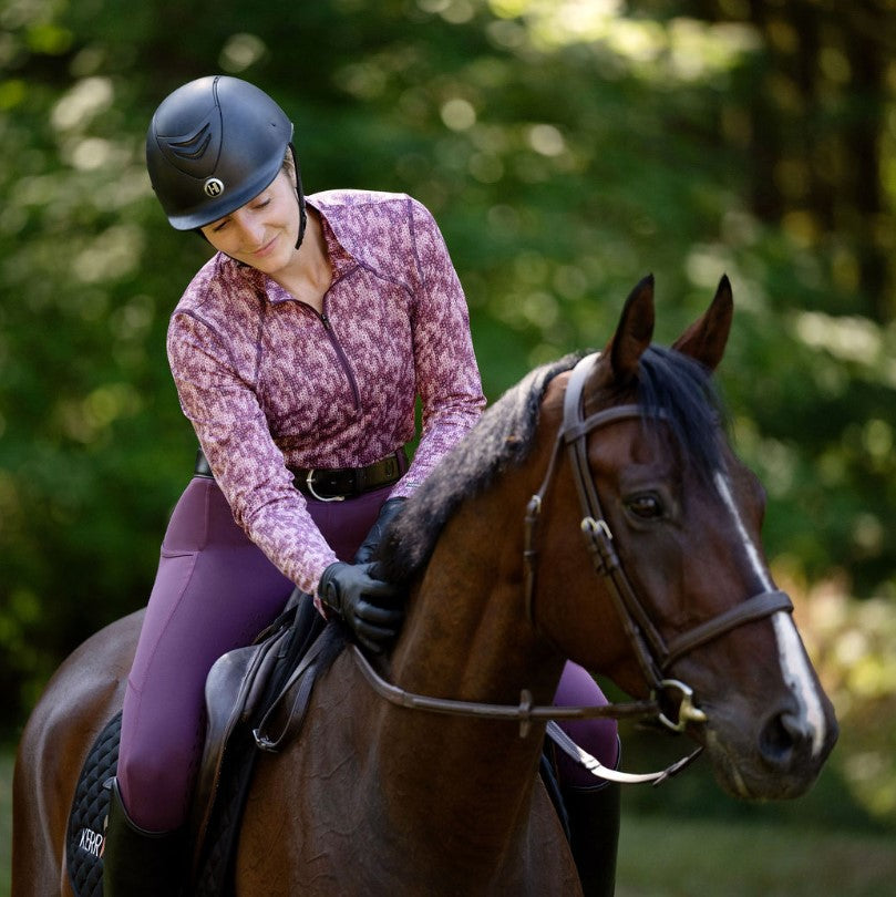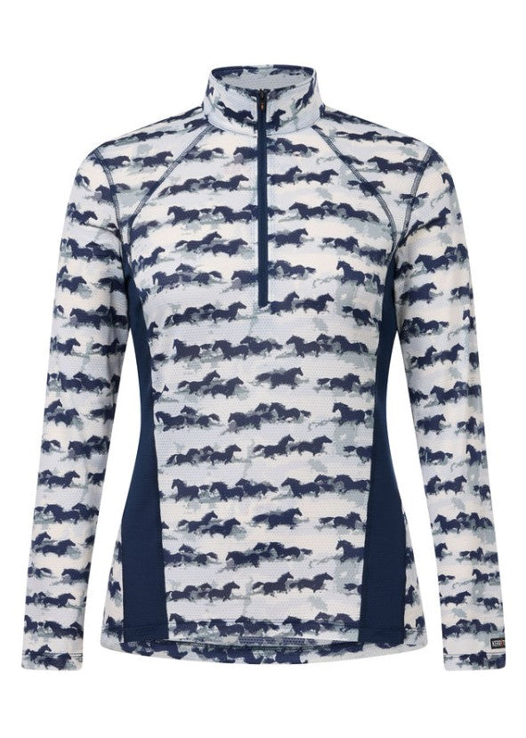 Ride in cool, sun-smart comfort with this ultralight long sleeve printed shirt, built for high-performance in hot weather. Ice Fil Lite fabric actively pulls moisture from the skin and dries fast, offering breathable, quick-drying coverage that feels weightless on even the hottest trails. UPF+30 protection shields from the sun. Equestrian-inspired prints flatter and cleverly camouflage dust and dirt, while contrast side panels enhance the feminine fit. Classic stand up collar with a ten-inch zip for extra ventilation so you can catch the breeze.