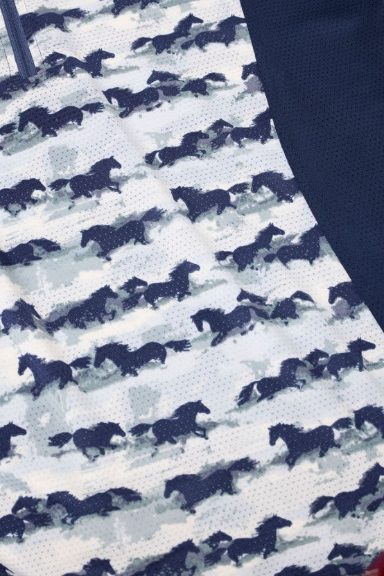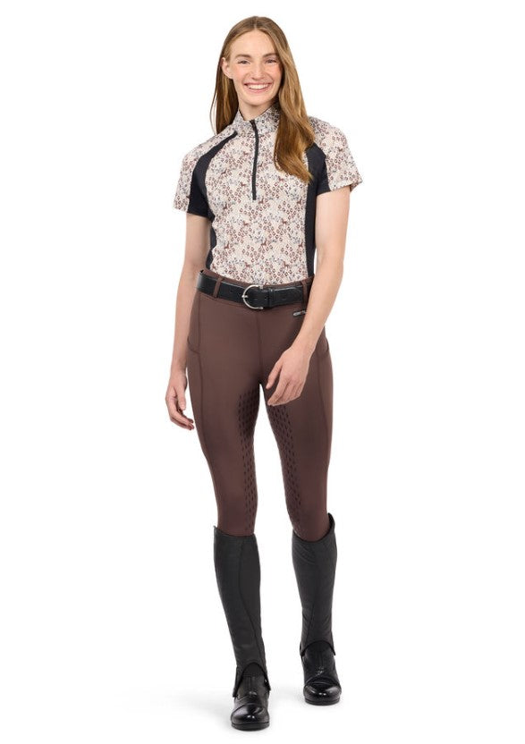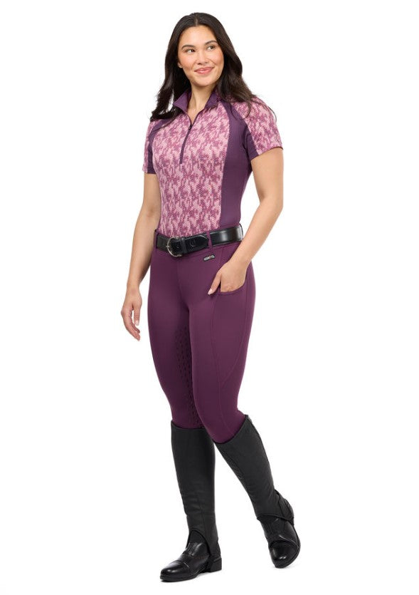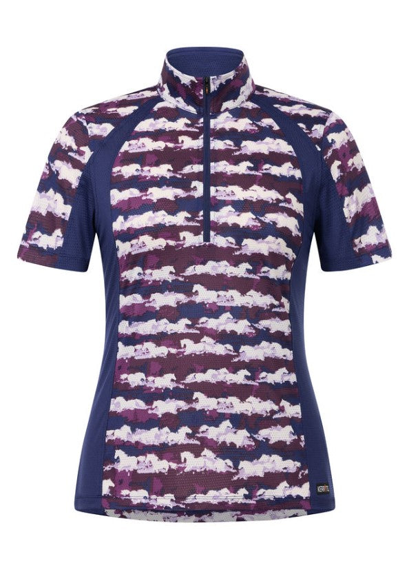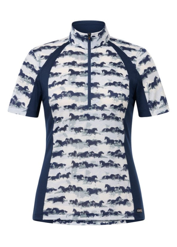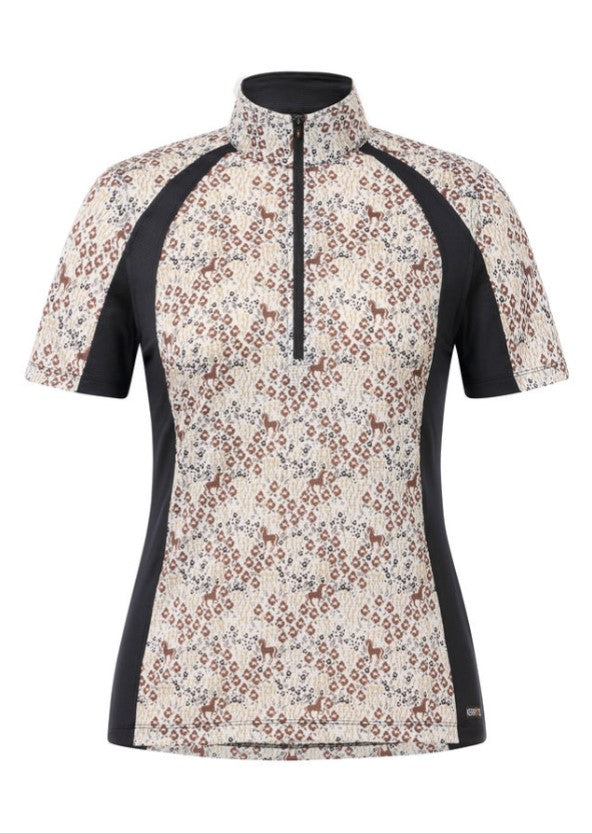Kerrits best-selling, ultra-lightweight short sleeve printed shirt, designed to keep riders cool in the hottest conditions. Ice Fil Lite fabric actively pulls moisture from the skin and dries fast, while UPF+30 protection shields from the sun. Equestrian-inspired prints flatter and cleverly camouflage dust and dirt, while contrast side panels enhance the feminine fit. Classic stand up collar with a ten-inch zip for extra ventilation so you can catch the breeze.