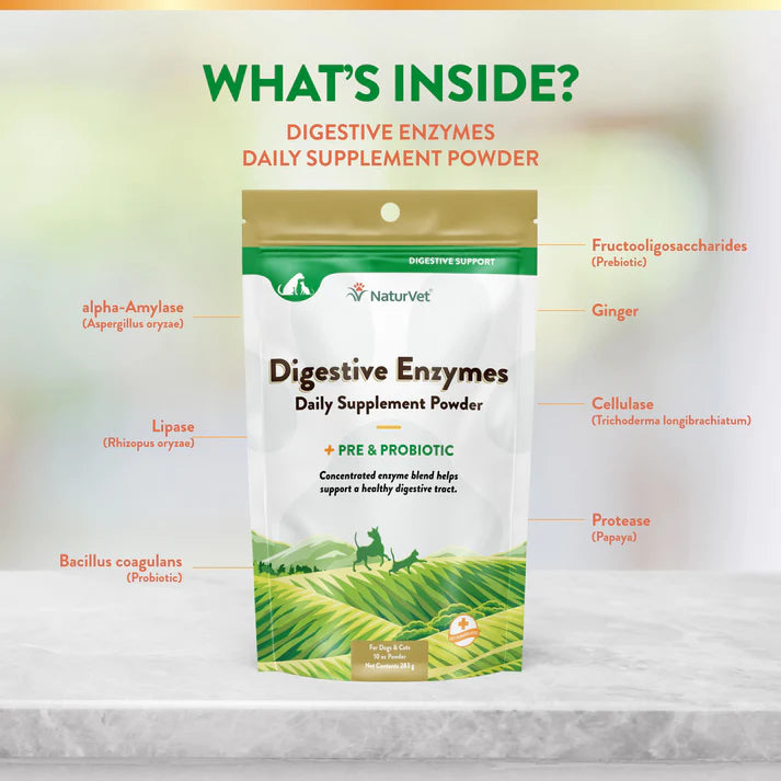 NaturVet® Digestive Enzymes Dog and Cat Supplement Powder is for use in dogs and cats over the age of 6 weeks. Concentrated enzyme blend derived from vegetable sources helps to support a healthy digestive tract and helps to replace enzymes lost in food processing. Contains a source of live (viable) naturally occurring microorganisms.