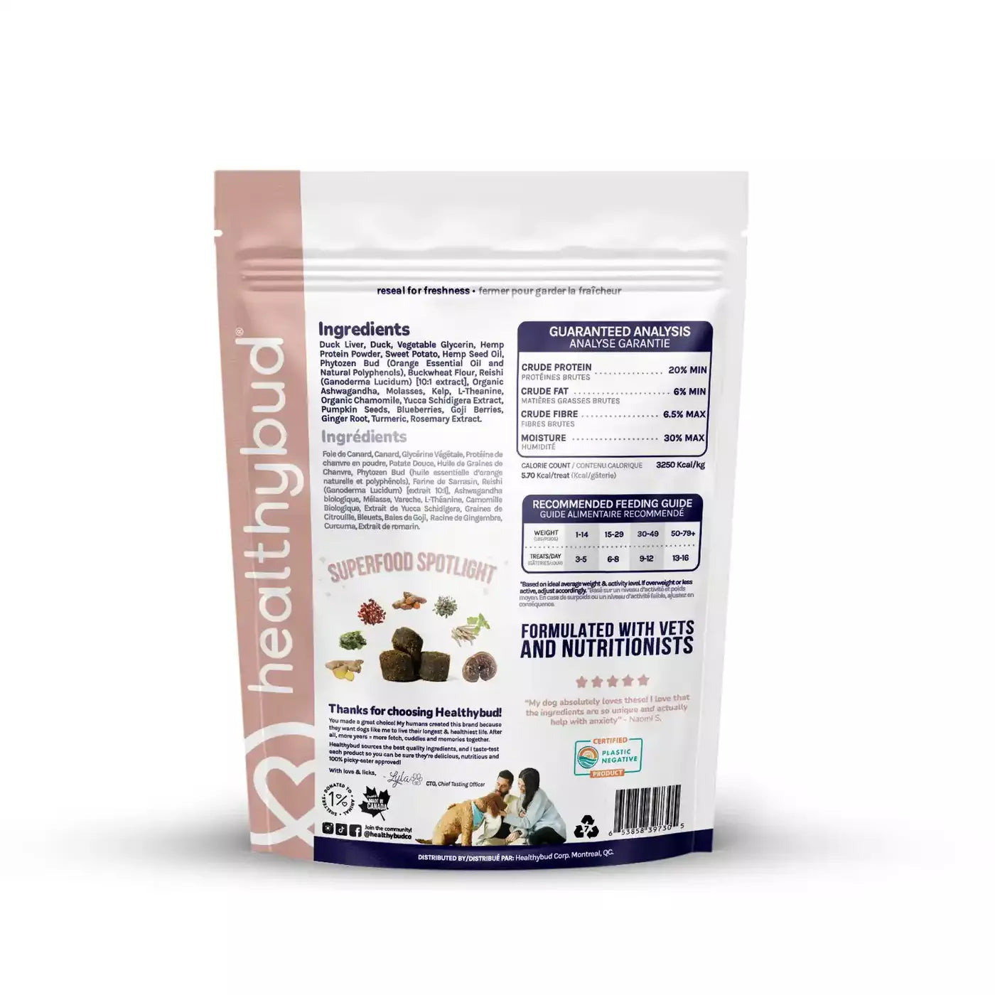 Duck Liver, Duck, Vegetable Glycerin, Hemp Protein Powder, Sweet Potato, Hemp Oil, Phytozen Bud (Orange Essential Oil and Natural Polyphenols), Buckwheat Flour, Reishi, Organic Ashwagandha, Molasses, Sunflower Lecithin, Kelp, L-Theanine, Chamomile Extract, Yucca Schidigera, Pumpkin Seeds, Blueberries, Goji Berries, Ginger Root, Turmeric Powder, Rosemary Extract.