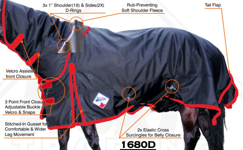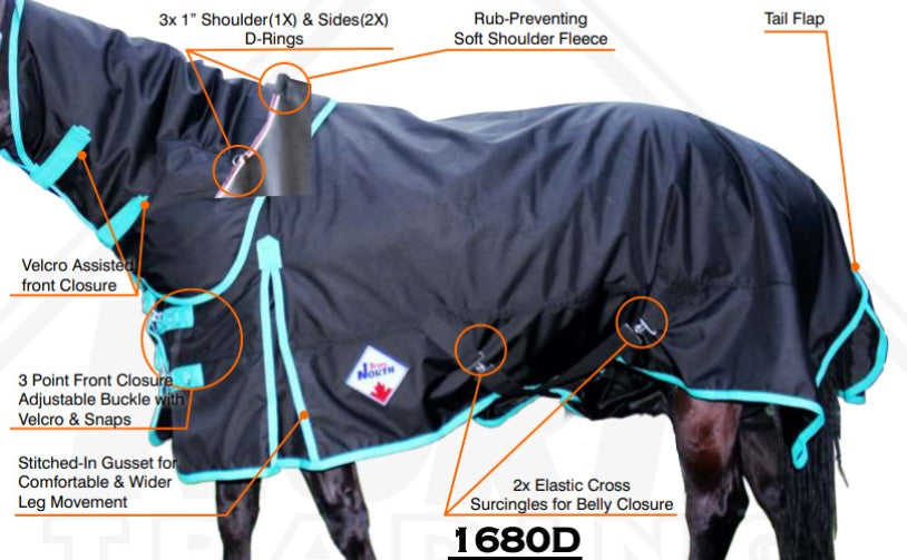 1680 Denier Quilted Detachable Neck (Included) Ripstop, Waterproof, Wind-proof Material 3 Point Front Closure Adjustable Buckle w/ Velcro and Snaps, Shoulder Gusset for Easy Movement Elasticized, Surcingle & Leg Straps 190 Tafta Breathable Poly Liner for Sweat Absorption Top Quality Thermal Retaining Poly Fill